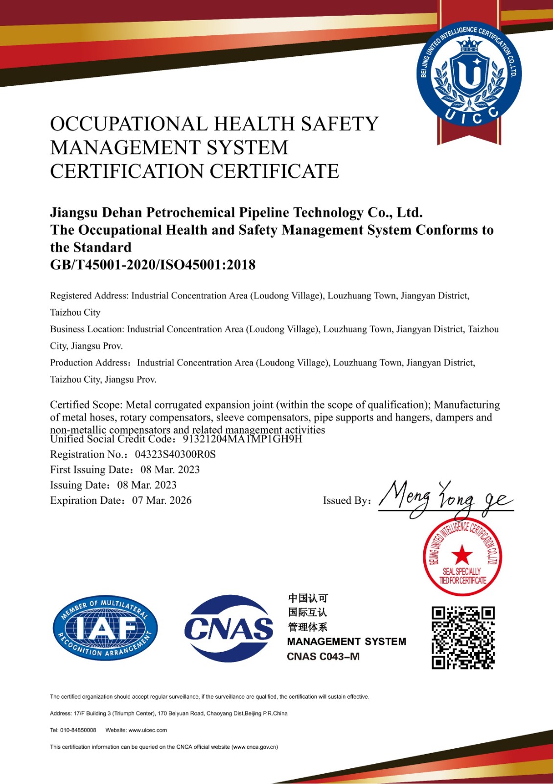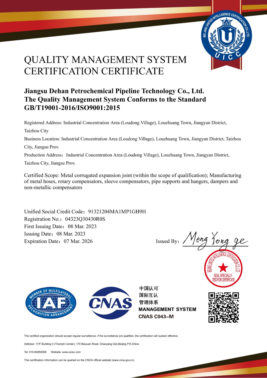 公司引進(jìn)大通徑的厚壁波紋管液壓成型設(shè)備及各種焊割、冷加工、精加工、檢驗(yàn)、熱處理爐等設(shè)備,其中重要設(shè)備均采用國標(biāo)數(shù)控系統(tǒng)。公司通過了ISO9001:2015質(zhì)量管理體系認(rèn)證、ISO14001:2015環(huán)境管理體系認(rèn)證、OHSAS18001:2007職業(yè)健康安全體系認(rèn)證;同時取得特種設(shè)備生產(chǎn)許可證。